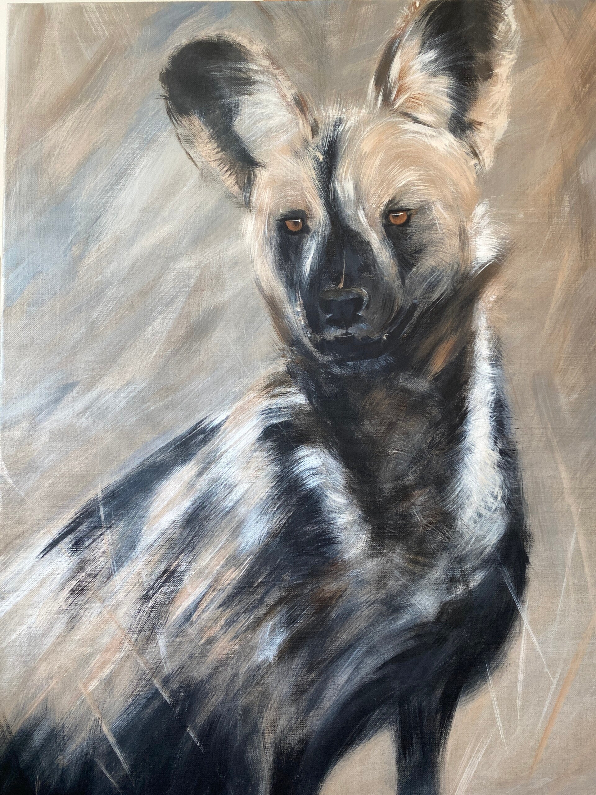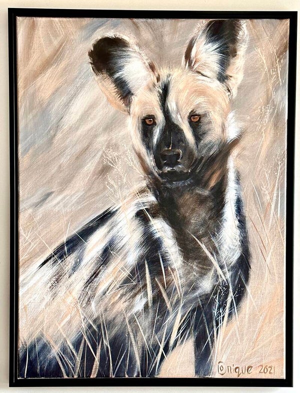 De wildehond heet ook soms die geschilderde hond. Ik vind de kleuren en vlekkenpatronen zo mooi. Deze schilderij is al ingelijst en de prijs is inclusief lijst. Klaar om je omgeving mooi(er) te maken dus!